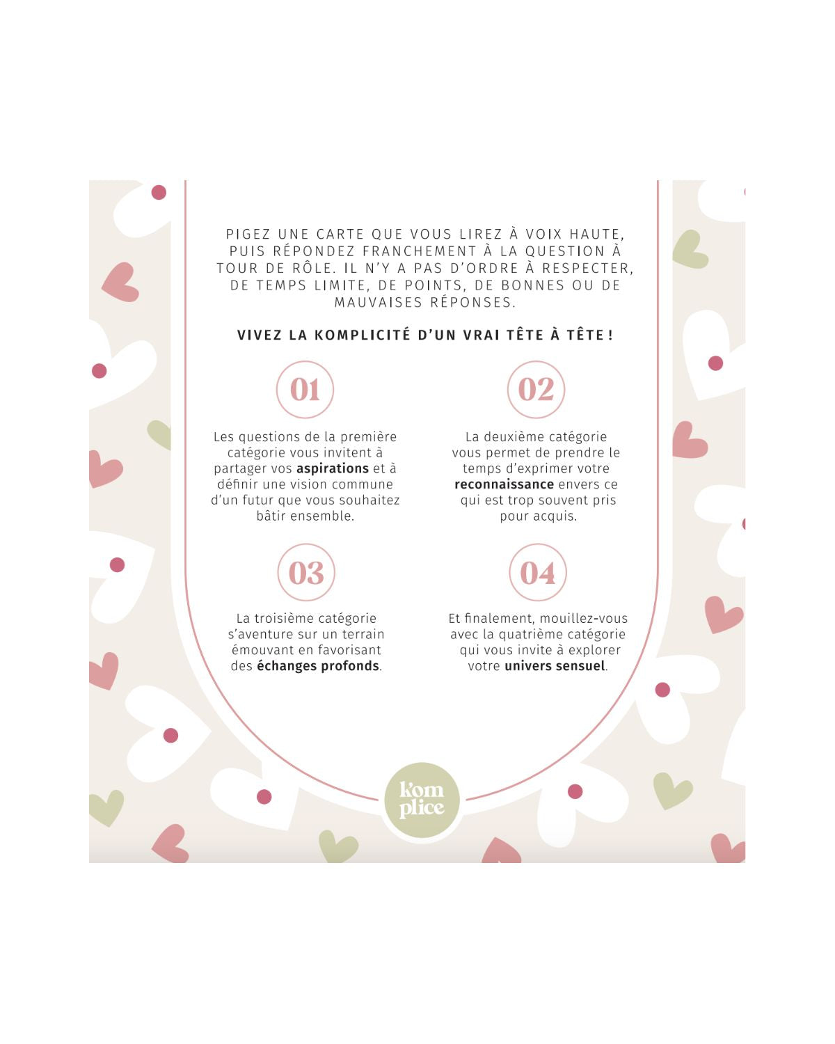 Pigez une carte que vous lirez à voix haute, puis répondez franchement à la question à tour de rôle. Il n’y a pas d’ordre à respecter, de temps limite, de points, de bonnes ou de mauvaises réponses. Vivez la komplicité d'un vrai tête à tête!